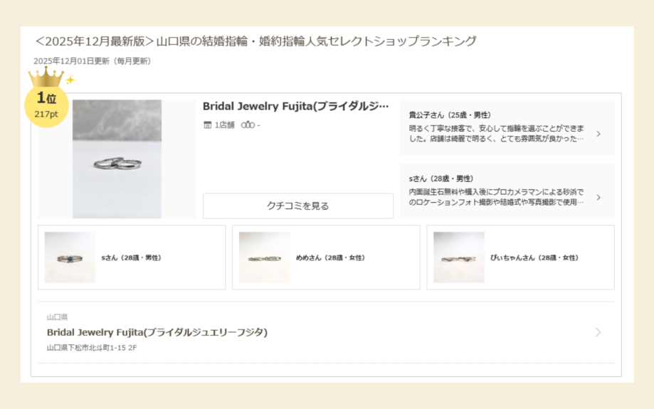 👑山口県の結婚指輪・婚約指輪人気セレクトショップランキング1位に選ばれました!