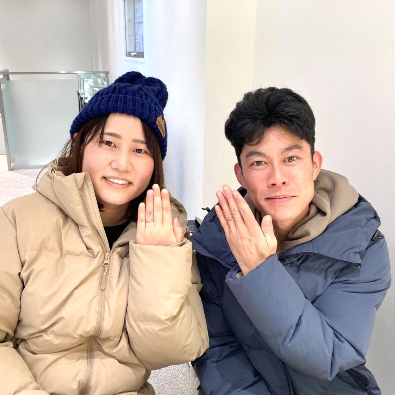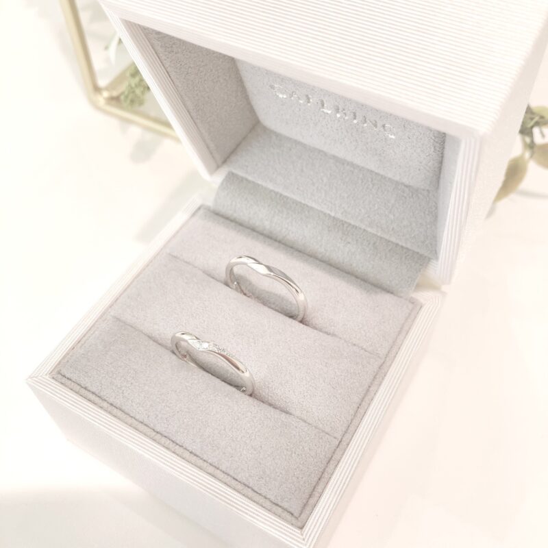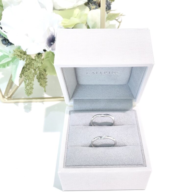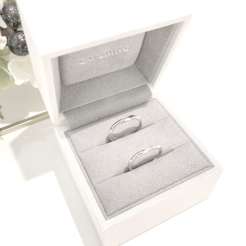 この度は誠におめでとうございます! おふたりの運命のリングになりましたのは、CAFERINGの『シェリ』でございます。 新郎様は全面鏡面に、新婦様の指輪にはアイスブルーダイヤモンドが輝き、おふたりのこだわりがつまったとても素敵な指輪に仕上がりました。 『シェリ』はおふたりが手を繋いでいるよう表現されたデザインで、大切な人を想いあいお互いをいつまでも繋ぐという意味合いを持っています。 指輪選びの際にもお互いを想いあう姿が印象的だったおふたりにぴったりで、とてもお似合いでいらっしゃいました。 当店でおふたりの大切な指輪をお選びいただき誠にありがとうございます。 またアフターメンテナンスなどでお会いできる日を楽しみにお待ちいたしております。 末永くお幸せに°˖✧ スタッフ:川野