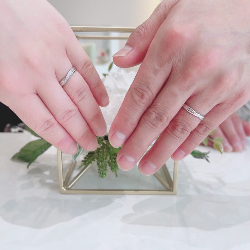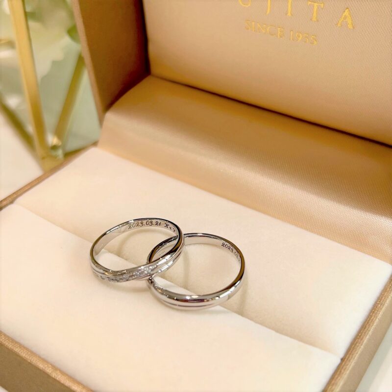 この度は誠におめでとうございます♡そして大変嬉しいお言葉をありがとうございます!明るくて華やかな雰囲気が素敵なお二人の指輪選びの時間をご一緒できましてとても幸せでした°˖✧なんと今回、遠路はるばる島根県からご来店いただきましたU様カップルがお選びされた運命のリングは当店オリジナルブランド「Fujita Original Selection」”リリィ” です。中央でクロスされたデザインに、レディースは贅沢にダイヤモンドをセットし華やかな印象を。メンズは幅広デザインで手のしっかりした方にもオススメでお二人共とってもお似合いでいらっしゃいました☺またメンテナンス等でお会いできることを楽しみにしています。どうぞ、末永くお幸せに♡ スタッフ:吉岡