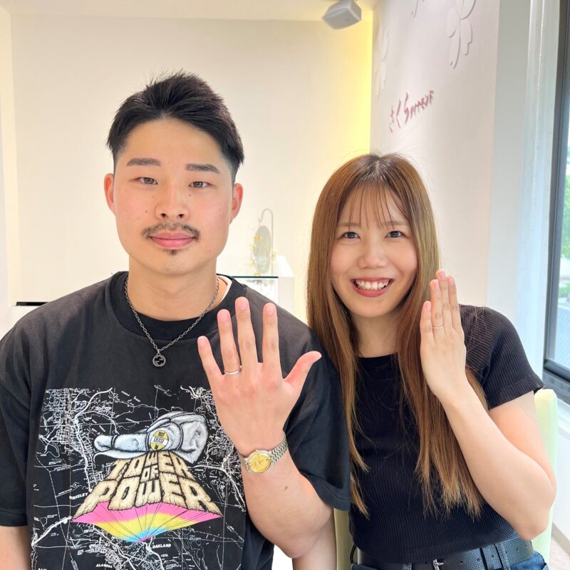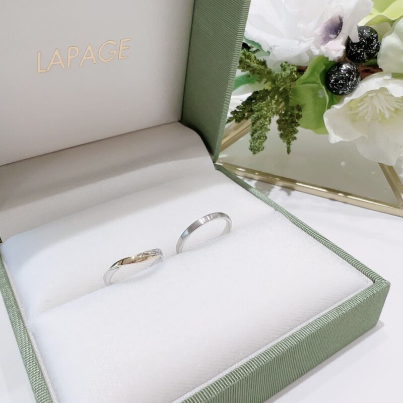 後日おふたりで結婚指輪選びにご来店いただき、選ばれましたのはLAPAGEの『ダリア』『プリュス』。ダリアはK18YGとプラチナ素材、さらにサイドにダイヤモンドを4石お留めするアレンジをお選びいただき、プリュスは表面にヘアライン加工を施すアレンジをお選びいただきました。こだわりが詰まったリングは、おしゃれなおふたりにとってもお似合いでいらっしゃいました♩