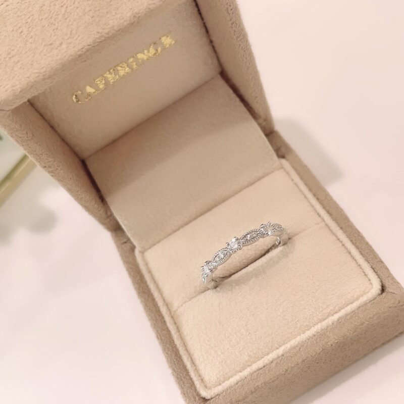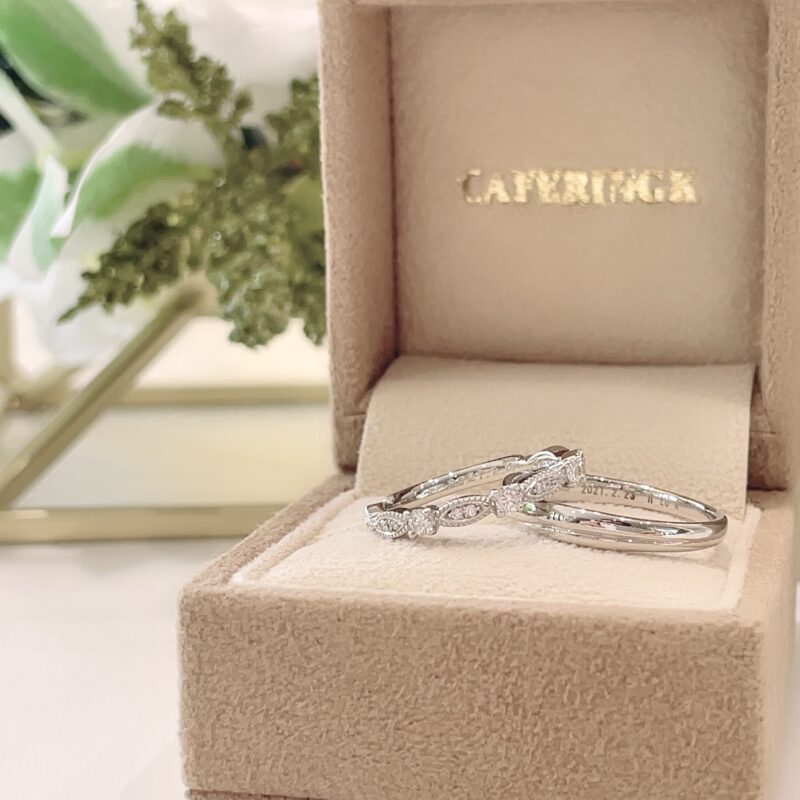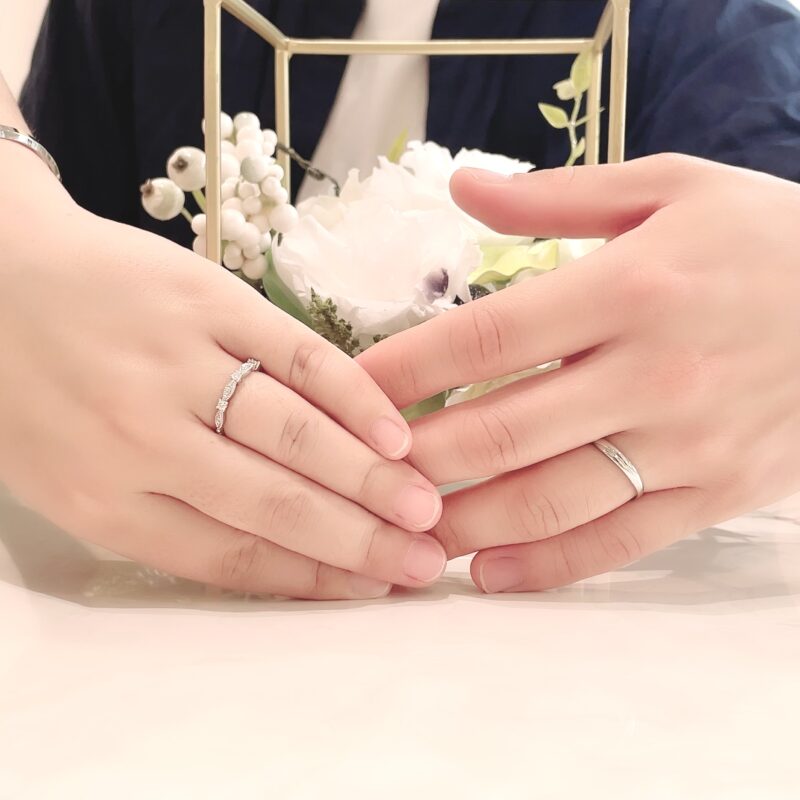 奥様にお選びいただきましたのはこの春デビューしたばかりのCAFERING Kの「パスィオン」です。どこから見てもダイヤが華やかに輝く可愛いデザインが特徴です。ご主人様にお選びいただいたのは当店オリジナルの「リリィ」で、中央でクロスするクールでおしゃれなデザインです。お二人ともとてもお似合いでいらっしゃいました♡