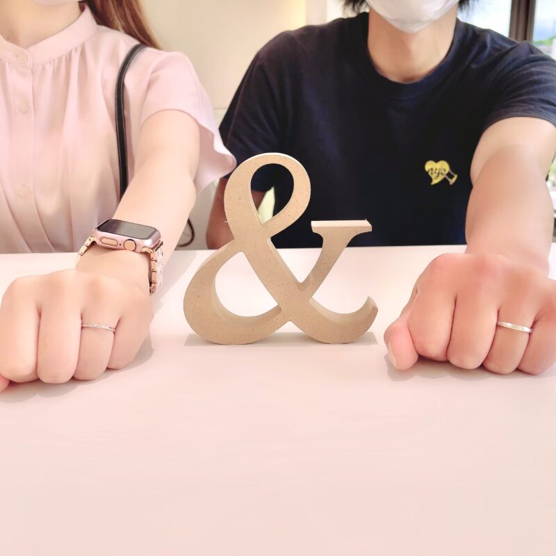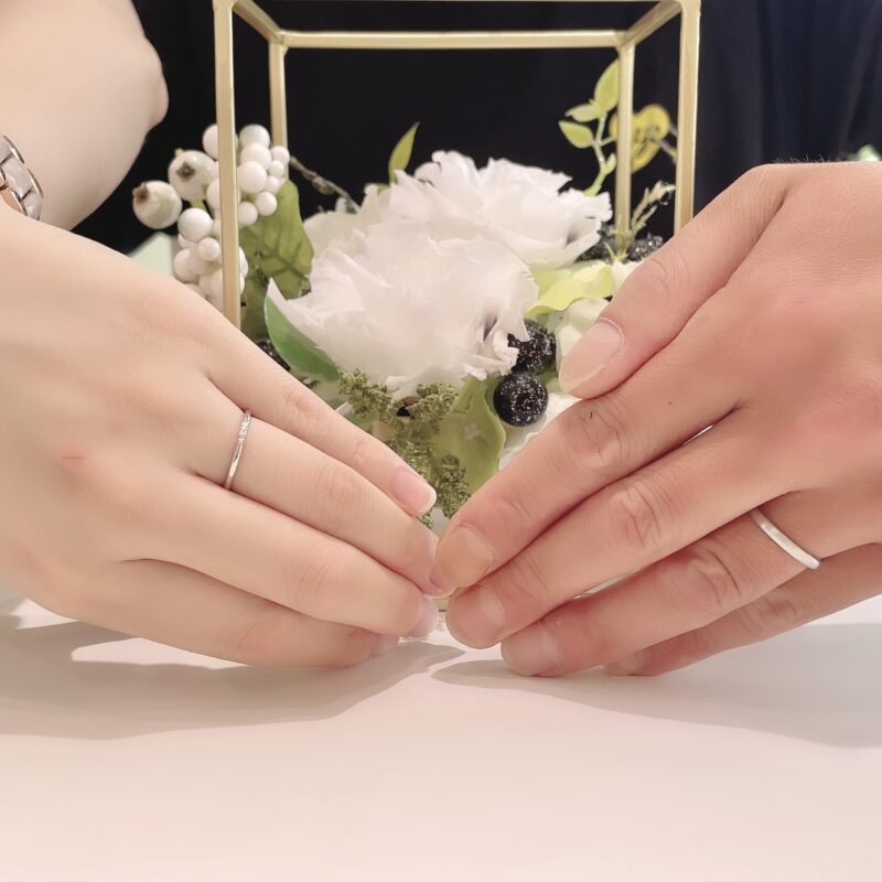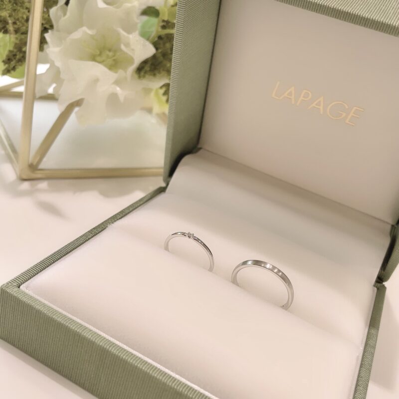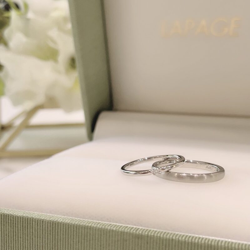 T様にお選びいただきましたのは "LAPAGE ラパージュ" の「Une アン」です。華奢な指輪がお好みのT様にぴったりのリングで、ほっそりとされたお手元にとてもお似合いでいらっしゃいました。S様にお選びいただきましたのは、同ブランドの「Plus プリュス」です。シンプルなストレートにヘアライン加工がクールで独特な光沢を放つおしゃれなリングで、とてもお似合いでいらっしゃいました。