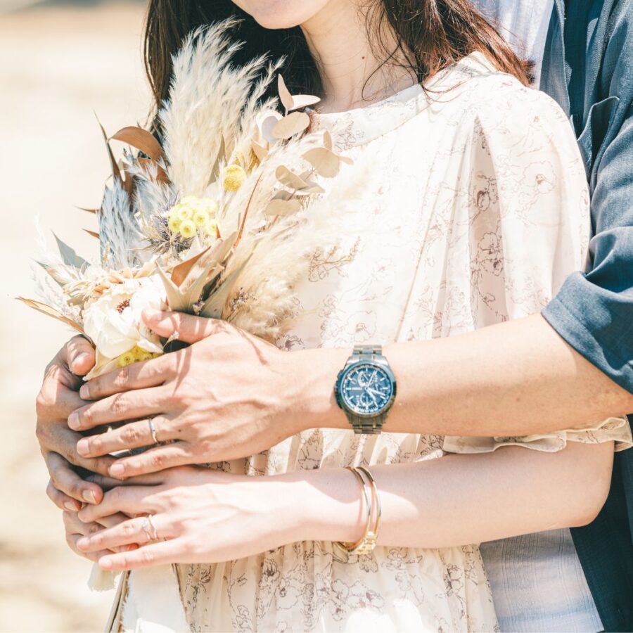この度は誠におめでとうございます。彼女様想いの素敵な彼氏様S様&おっとり可愛らしいA様の仲良しカップルにお選びいただきましたのはHOSHI no SUNA「VESTA/ヴェスタ」です。婚約指輪はストレートラインのサイドメレデザインで、A様にとてもお似合いのピンク色の石「ピンクサファイア」でサイドをアレンジさせていただきました。結婚指輪はV字ラインでMen'sは洗練された印象に、Lady'sは流れるようにダイヤモンドが指の片側サイドまで留まった上品で華やかなデザインです。セットで重ね付けた際の可愛らしく上品なデザインがとても素敵で、おふたりの雰囲気によくお似合いでいらっしゃいました。ロケーションフォト撮影も楽しんでいただけて何よりです✨この度は素敵なご縁をありがとうございました。またメンテナンス等でお会いできる日を楽しみにしております!どうぞ末永くお幸せに…♡ スタッフ:藤田文香
