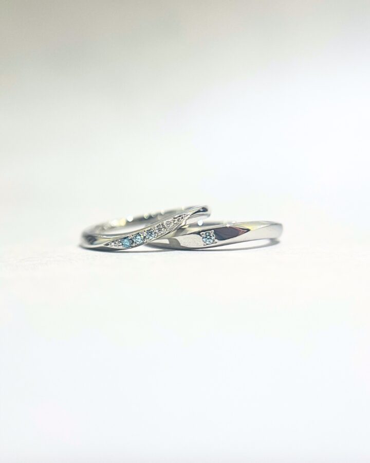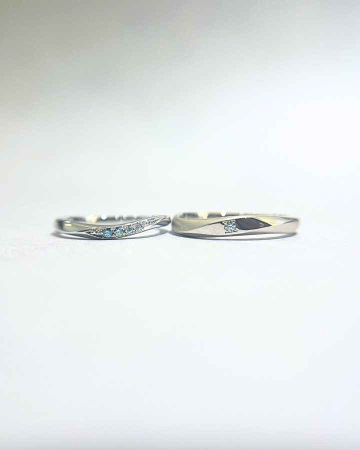 ZEXYをご覧いただき、ご指名でご来店くださいました。緩やかなウェーブラインで落ち着いた雰囲気のリングで、Men'sはサイド部分マットと1石アイスブルーダイヤを、Lady’sはアイスブルーダイヤのグラデーションカラーをお楽しみいただけるデザインです。彼女様がブルーがお好きということで、一目惚れされたそうです♡おふたりの雰囲気にとてもよくお似合いでいらっしゃいました✨