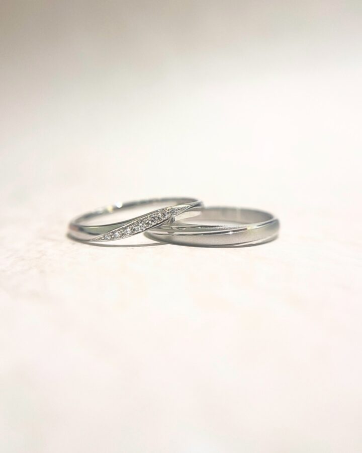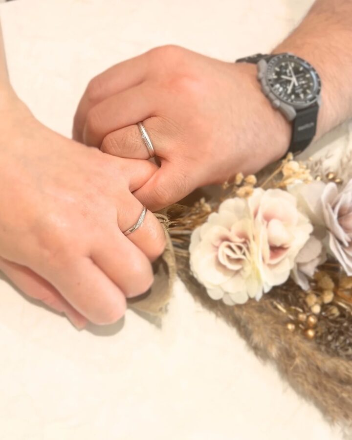 Y様には重厚感のある甲丸リングにマット加工が施された、スタイリッシュなデザインのL’or「LPP012」を。K様には大きめのメレダイヤがグラデーションで並ぶ、上品で華やかなBELETHE「RIZE」をお選びいただきました💍それぞれ気に入ったデザインを、と異なるブランドのリングでオーダーいただきましたが、最後までお揃いにしようかと悩まれるK様とそれを見守り優しく背中を押されていたY様…そんなおふたりの姿がとても温かく印象的でした。