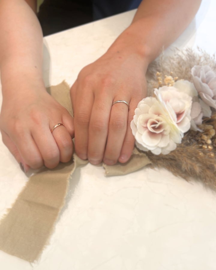 おふたりらしいおしとやかな雰囲気で指輪をお選びになられていたのですが、おふたりだけの空間になるとにぎやかで楽しそうなお声が聞こえ、、そんな仲睦まじいお姿に密かにときめいておりました…!