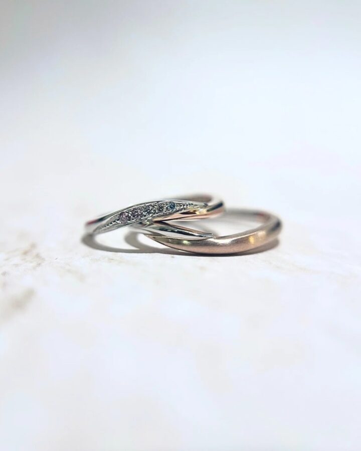 まさ様のリングにはローズゴールド部分にヘアライン加工を。優しい色味のローズゴールドにスタイリッシュな要素が加わりとてもおしゃれに仕上がりました。