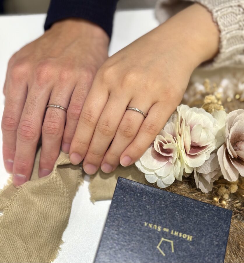 癒されるような柔らかい雰囲気のおふたりにお選びいただきましたのは、HOSHInoSUNA「シリウス」。ゆるやかなウェーブラインのシンプルなデザインに、HOSHInoSUNAならではの星型の石座に留められたメレダイヤが輝きます💎