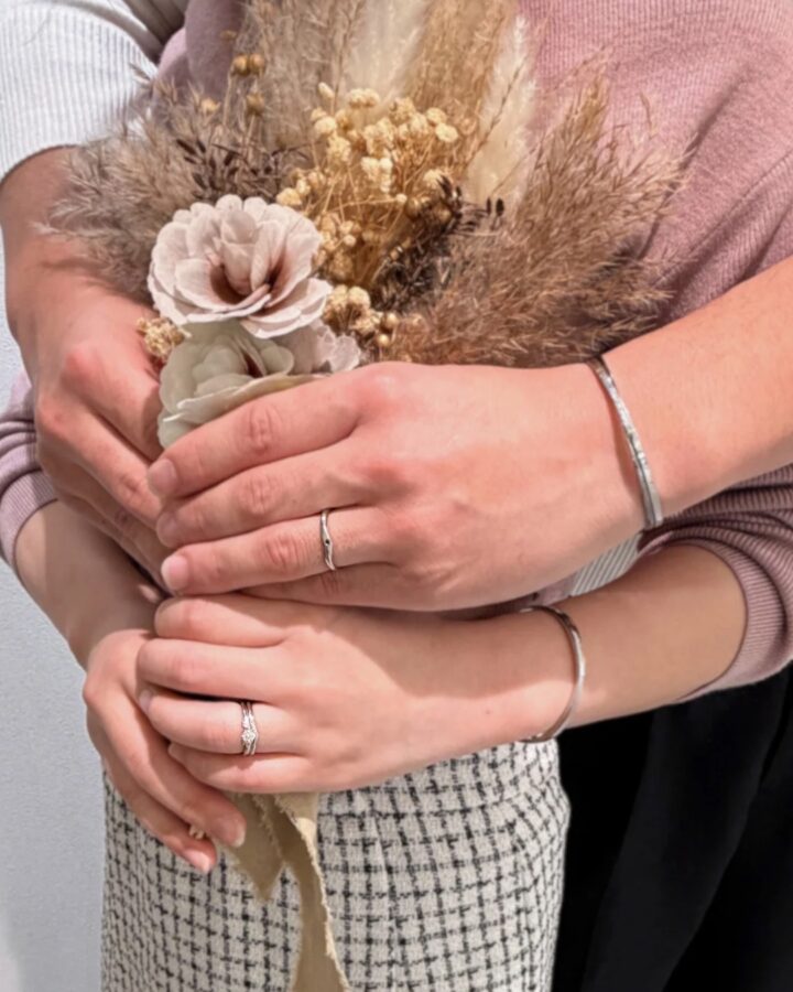 素敵なプロポーズのあとおふたりでご来店いただきお選びいただいたのは、N様が事前にチョイスされていたBELETHE「ルフナ」のエンゲージリング。サイドのマーキスカットダイヤがお洒落なリングです。