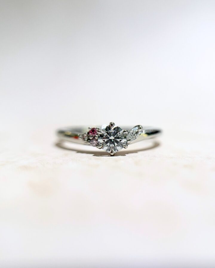 ピンクが大好きな彼女様を思い、最初のご来店から貴重なピンクダイヤモンドのセッティングも計画していらっしゃった素敵な彼氏様…。色の濃さやお留めする位置などもおふたりでお選びいただき、こだわりの詰まったとても可愛らしいセットリングになりました。