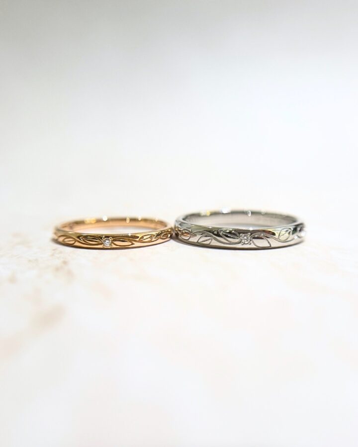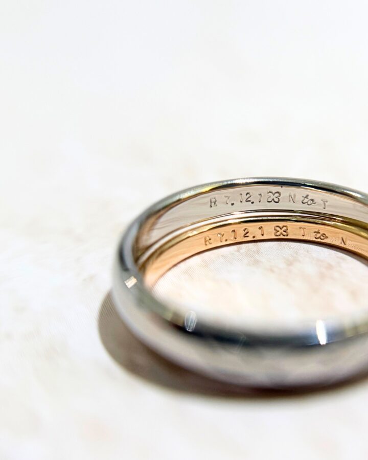 野に咲く"白い花"をイメージした結婚指輪をプラチナとピンクゴールドで作成しダイヤを正面にセット。内側にはアイスブルーダイヤとタンザナイトで2人らしい特別感のある指輪に仕上がりました。