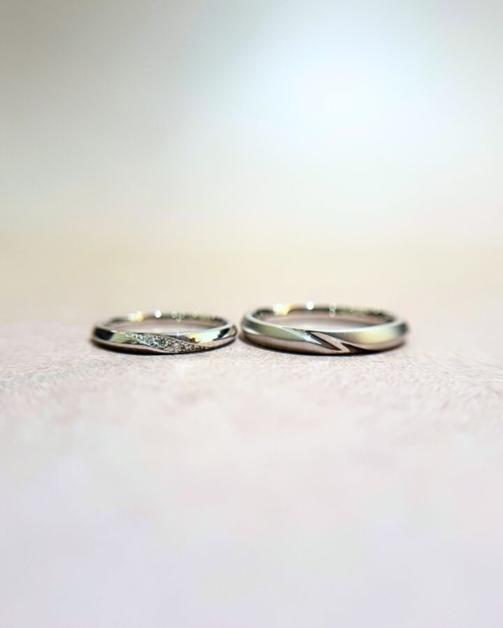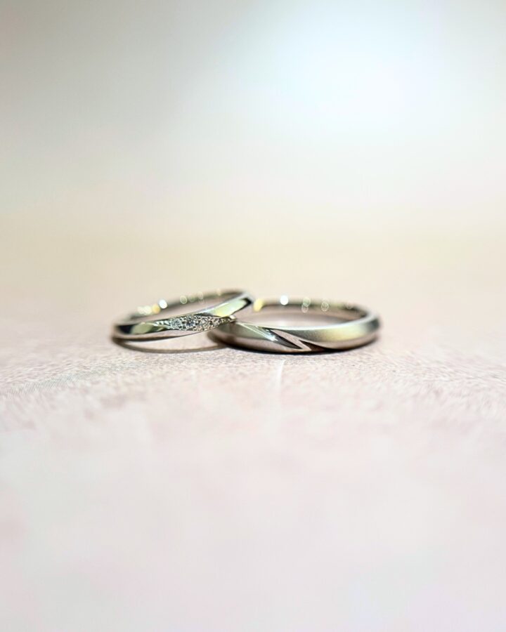 おふたりの運命のリングとなりましたのは、CAFERINGの「リュミエール」。心地良い幅感のストレートリングとお揃いの美しいラインが魅力的なデザインです。リュミエールをご試着いただいた瞬間に、”これがいいね…!”とおふたりの意見もぴったり一致され、まさに運命の出会いでした ˖✧