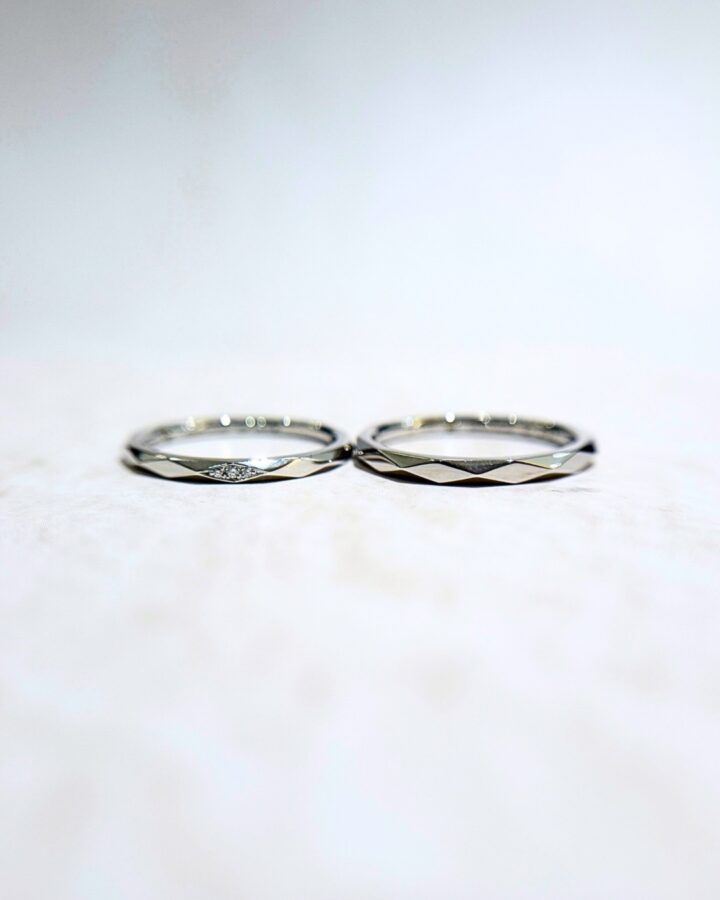 結婚指輪に選ばれましたのは、HOSHInoSUNA「スパーク」。指輪全体に施された多面カットが煌めき、見る場所によってさまざまな表情を楽しむことができるデザインが魅力的です💍指輪をご試着いただいてるうちに「せっかくなら…!」と、結婚指輪に重ね着けをして楽しむことができる、シンプルなソリティアの婚約指輪もお求めいただきました✨それぞれの魅力をさらに際立たせてくれる、素敵なセットリングが仕上がりました。