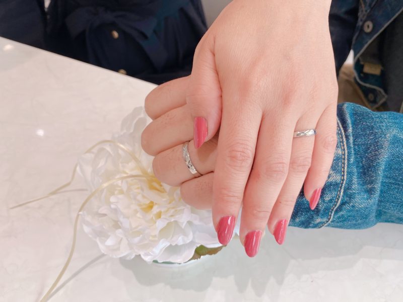 この度はおめでとうございます!美人で楽しい奥様と、がっちりして頼もしい旦那様の素敵なおふたりです♡ 仲良く楽しみながらお選びいただいた姿がとても印象的です。 お選び頂きましたのは貴金属の中でトップクラスの高硬度を誇る「Ptau ピトー」のマリッジリングで、美しいキルトデザインで幅広のタイプです。奥様のほうにはダイヤモンドを1石お留めして高級感のある仕上がりとなりました。 この度は遠くからご来店いただきまして、そして素敵なご縁を誠にありがとうございました。 クリーニングや磨きなおしなどアフターもしっかり対応させて頂きますので またお近くにお越しの際はどうぞお気軽にお立ち寄りくださいませ。 またお会いできる日を楽しみにいたしております。 スタッフ:藤田祐実