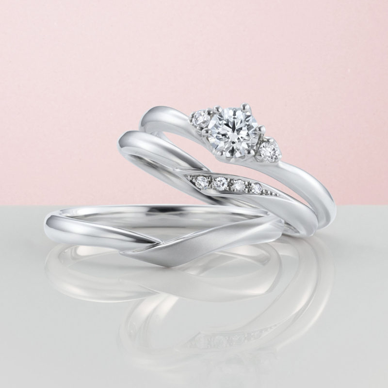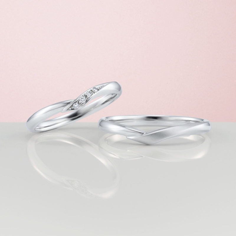 リングのお気に入りポイントはV字型で一部分だけがつや消しの所がかっこよく、かわいさもある。 色々悩んでおりましたが、私たちに合った指輪をご紹介いただきありがとうございます。