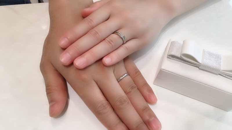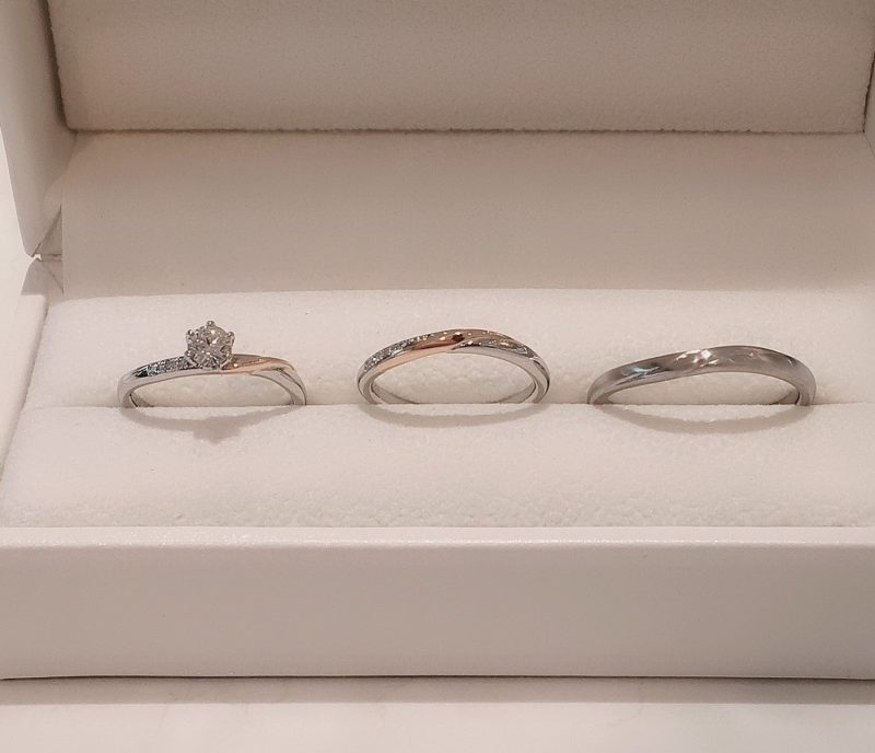 婚約指輪と結婚指輪を重ねて着けた時のピンクゴールドのラインがすごくキレイで気に入っています。 この度は突然の来店にもかかわらず、親切・丁寧に対応して頂き、お互いにとても納得できる指輪を見つけることが出来て満足しています。本当にありがとうございました。