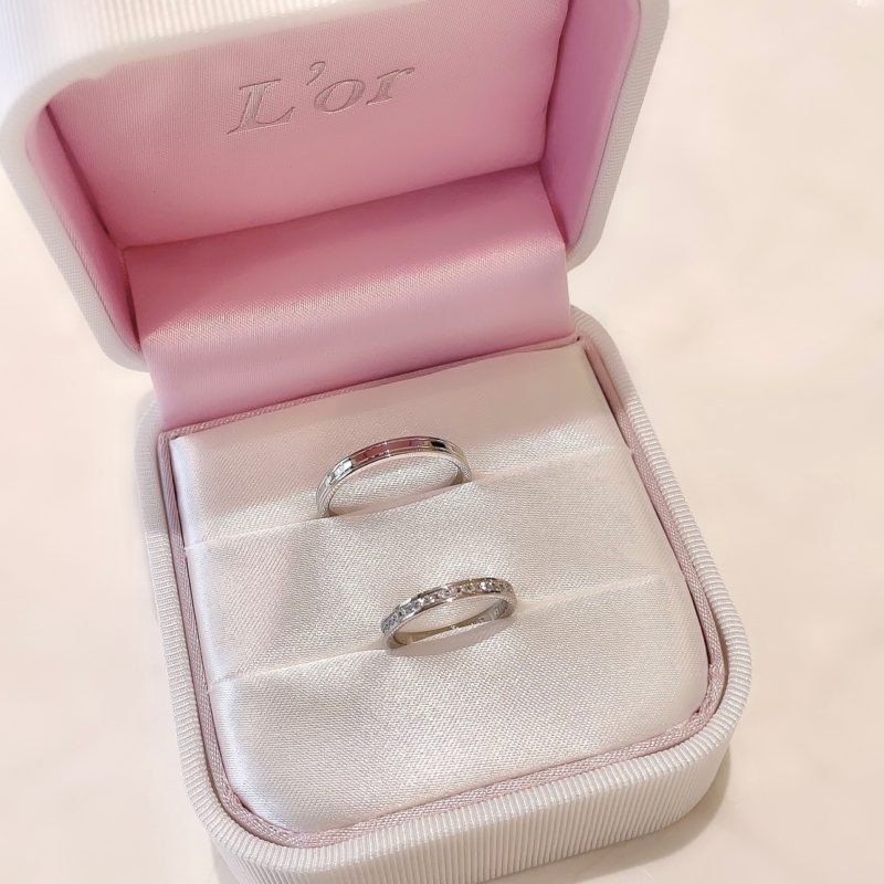 以前に当店をご利用いただいたお客様のご紹介でご来店いただきましたFさまカップルです♡ 細い指でとっても可愛い新婦様といつも明るい冗談で和ませる新郎様で、お互いに想い合いながら指輪選びをされる姿が印象的なおふたりです。 婚約指輪には王道なストレートのソリティアタイプを。結婚指輪にはハーフエタニティデザインのリングをお選びいただきました。華奢な指にダイヤモンドの輝きがぎゅっと詰まったデザインが本当に綺麗で思わず見とれてしまうくらいお似合いでいらっしゃいました・・・♡ メンズはサイドのラインがスタイリッシュなエッジの効いたデザインです。 内側には秘密のメッセージをお入れして特別な指輪が出来上がりました。 この度は素敵なご縁を誠にありがとうございます。どうぞ末永くお幸せに♡ またお会いできる日を楽しみに致しております。 スタッフ:藤田祐実