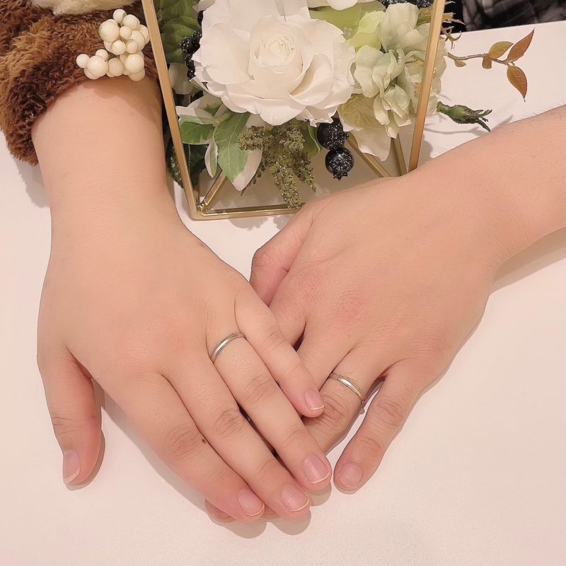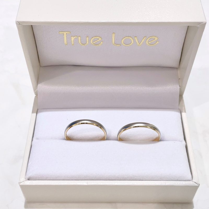 ご入籍まであともうすぐのMさまカップルです♡ この度は本当におめでとうございます! HPでご覧いただいていたTrueLoveの指輪。「実物も可愛い!」と一目惚れでご成約頂きました♡ プラチナのマット加工にゴールドの艶ラインがさりげなく華やかさをプラスするおしゃれなマリッジリングです。 指輪を着けて嬉しそうにされる姿がとっても可愛かったです(*ノωノ)♡ ぜひこれからも大切にたくさん着けられてくださいね。またクリーニング等でお会いできる日を楽しみに致しております。この度は誠にありがとうございました! スタッフ:藤田祐実