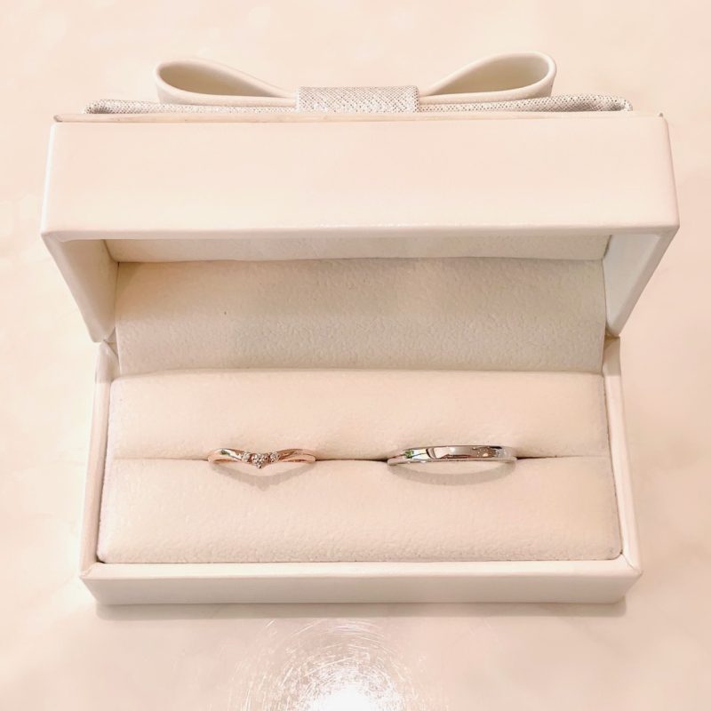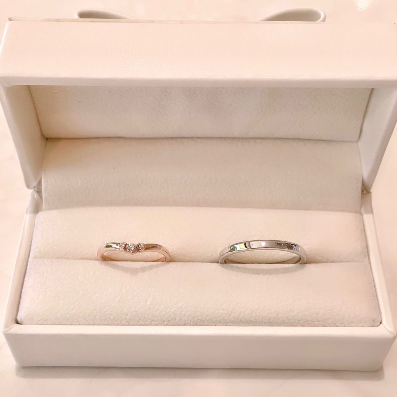 この度は誠におめでとうございます!にこにこで可愛い新婦様と頼もしい新郎様の仲睦まじいおふたりです♡ お選びいただきましたのは当店オリジナルリングの「Fraise フレーズ」。女性用は3石可愛く並んだダイヤモンドが映えるピンクゴールドを、男性用は王道で飽きの来ないストレートのタイプをホワイトゴールドをお選びいただきました。内側にはそれぞれの誕生石をお留めしました。 "守り石" の意味を持つ誕生石がそっとおふたりを見守ります。この度はお二人の大切な指輪を当店でお選びいただきまして誠にありがとうございました!どうぞ今後とも末永くお幸せに・・・♡ スタッフ:藤田祐実