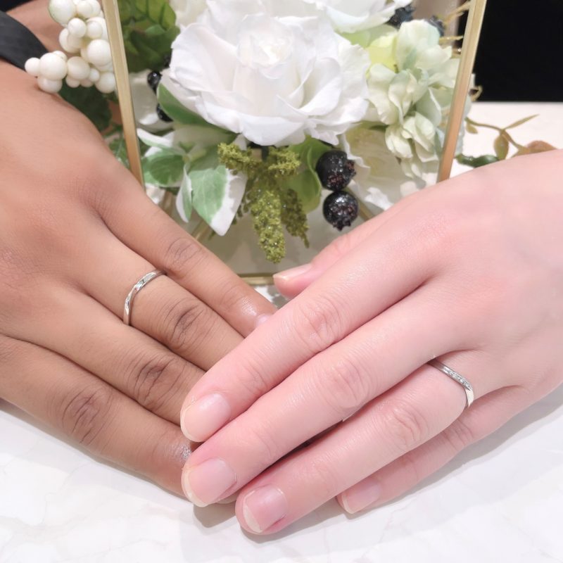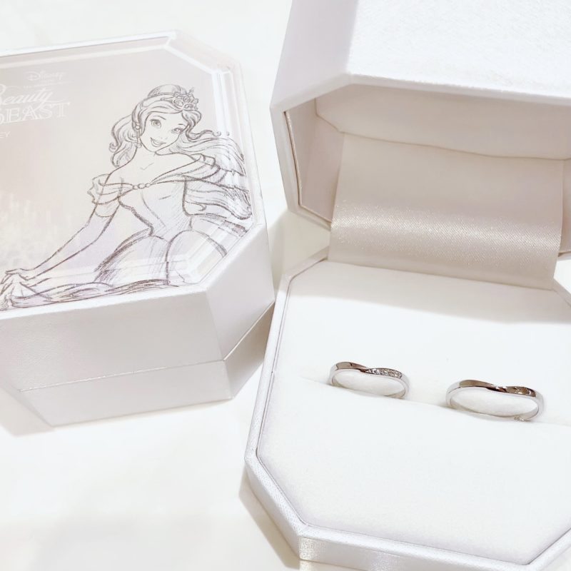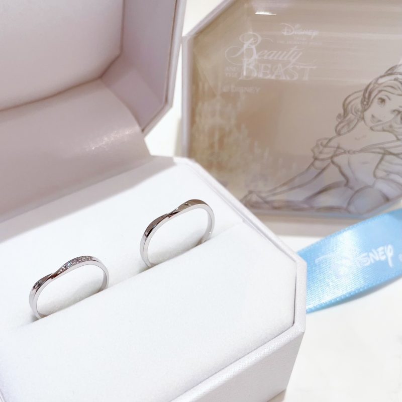 この度は誠におめでとうございます! おしゃれなお二人には美女と野獣のマリッジリングをお選びいただきました。 指をすっきりと見せるV字のデザインで、ゆるやかな指輪のラインは物語にも登場するバラの花びらの重なりをイメージしてデザインされています。レディースリングには永遠を意味するダイヤモンドが散りばめられており、薬指でまばゆい輝きを放ちます。 メンズのリングは少し幅広でひねりがあり、クールな印象です。 華やかな新婦様にも、がっちりとした新郎様にもとてもお似合いでいらっしゃいました。 この度はお二人の大切な結婚指輪を当店でお選びいただきまして誠にありがとうございました。またクリーニング等でお会いできる日を楽しみにいたしております。どうぞ末永くお幸せに・・・!♡ スタッフ:藤田祐実