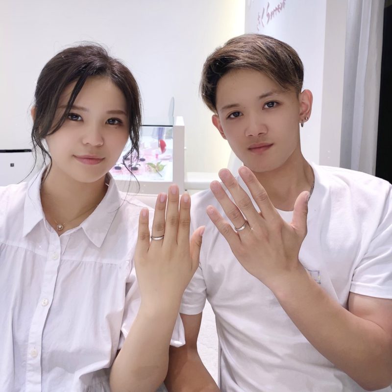 おしゃれなT様ご夫妻です♡ この度は誠におめでとうございます! 槌目加工のリングや幅広リングなど候補が上がった中で運命のリングとなったのはカフェリングの「セレモニー」です。スタイリッシュでエッジの効いたのデザインをベースに、プラチナとゴールドの2色使いでファッショナブルに仕上がりました。また、メンズはクールに仕上がるイエローゴールドを、レディースは肌なじみの良いピンクゴールドをお選びいただき、ペア感は残しつつお互いのこだわりが感じられる結婚指輪が出来上がりました。 シンプルながらおしゃれ!というまさにお二人にぴったりのリングです♡ 本当にお似合いでいらっしゃいました。 T様、この度は素敵なご縁を誠にありがとうございました。またクリーニング等お気軽にご来店くださいませ。どうぞ末永くお幸せに・・・! スタッフ:藤田祐実