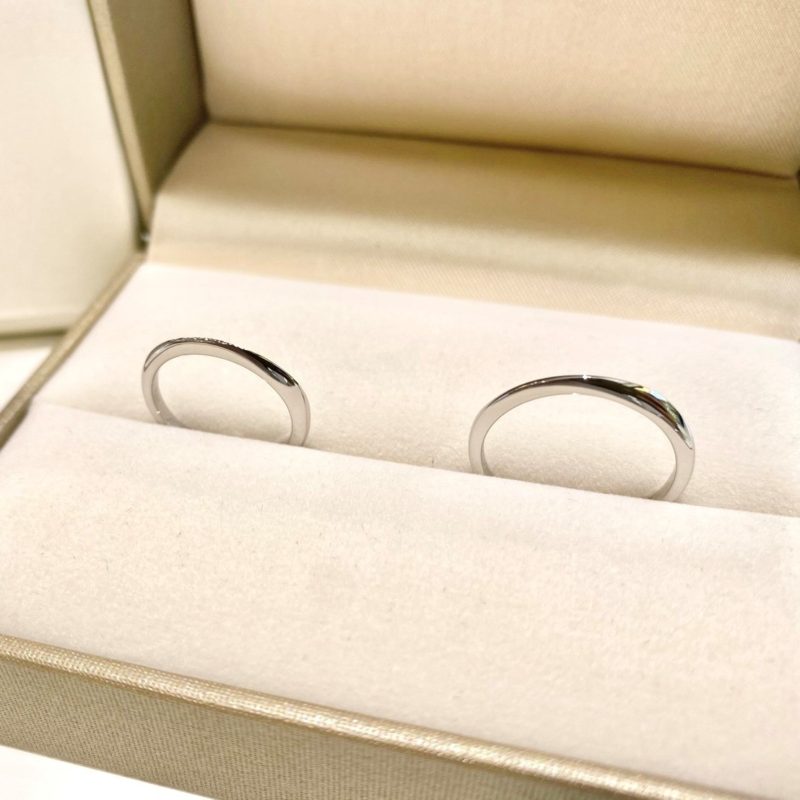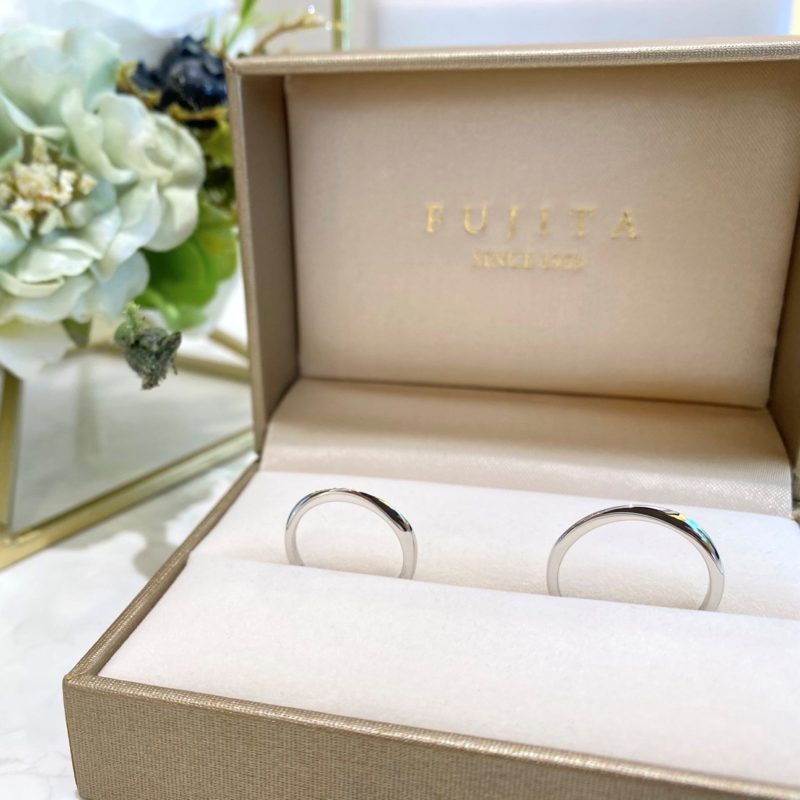この度はおめでとうございます。笑顔の可愛い奥様と優しいご主人様、そんなお二人がお選びされたリングは「Fujita Original Selection」 ” MILTONIA ミルトニア ” 華奢な幅のリングですがサイドから見るとまた違った印象になりお二人にとてもお似合でいらっしゃいました。このリングのようにいつまでもお二人の未来が輝かしいものでありますよう祈っております。またメンテナンス等でお会いできるのを楽しみにしております。どうぞ、お幸せに♡ スタッフ:畑山紗