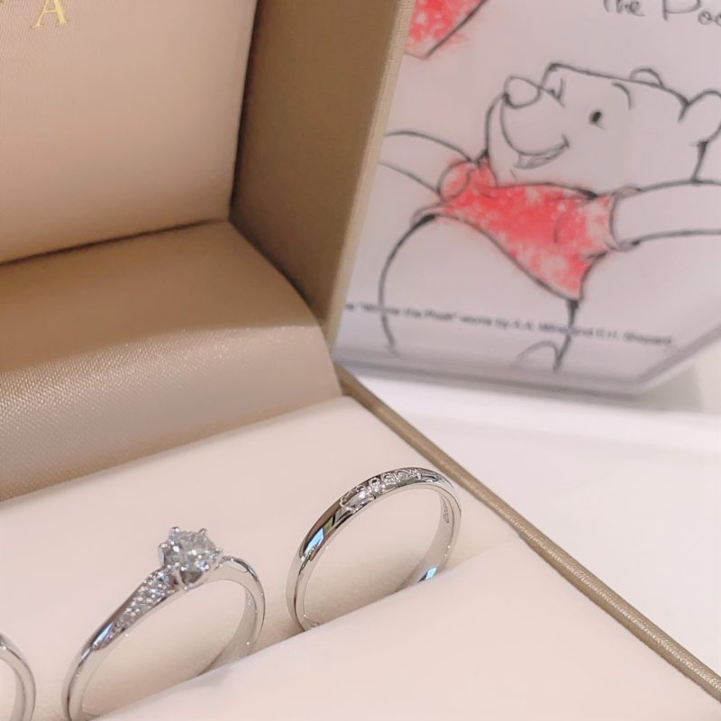 この度は誠におめでとうございます!最初にお二人でご来店いただいたのは昨年の夏でした。結婚指輪をご覧いただき彼女様のお好きなプーさんのリングに出会っていただきました♡ それからしばらくして今度は彼氏様がお一人でご来店され、彼女様へ改めてプロポーズをと婚約指輪をお選びいただきました。ちゃんと気持ちを伝えようと真剣にリングとダイヤモンドをお選びいただく姿に彼女様への大きな愛を感じました °˖✧ 彼女様の大好きなプーさんのデザインのマリッジリングと、彼氏様に気に入っていただいたシンプルなマリッジリングとお揃いのエンゲージリングと、お二人ともにご満足いただけてとても嬉しく思います。 またしっかりとアフターメンテナンスもご対応させていただきますのでいつでもお気軽にお立ち寄りくださいませ。この度は素敵なご縁を誠にありがとうございました。 スタッフ:藤田祐実