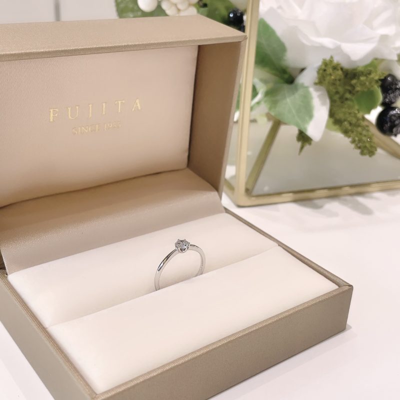 最初は彼氏様がお一人でご来店いただき、婚約指輪をご成約いただきました。真剣なまなざしで彼女様のことを想いながらお選びいただいたのはシンプルなソリティアデザインで、まさにプロポーズの王道!という指輪です。