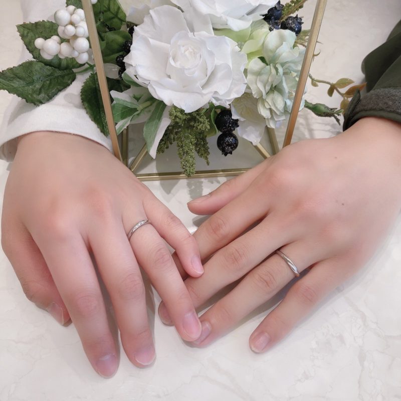 この度は誠におめでとうございます。最初のご来店は彼氏様おひとりでサプライズの婚約指輪をお選びいただきました。婚約指輪『CAFERING Aimer エメ』は美しいウェーブラインが、ふたりの愛が流れる時を表現した飽きのこないトラディショナルデザインで、結婚指輪『CAFERING Plage プラージュ』は 優しく流れるダイヤモンドの輝きが、澄んだ海の波音が奏でる優しいささやきのようにいつもお互いをそばに感じさせてくれる結婚指輪です。お二人の柔らかい雰囲気にとってもお似合いでいらっしゃいました♡この度は素敵なご縁をありがとうございます。またクリーニング等でお二人にお会いできる日を楽しみにしております。どうぞ末永くお幸せに、、、。 スタッフ:藤田文香