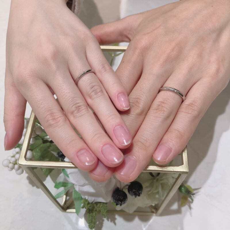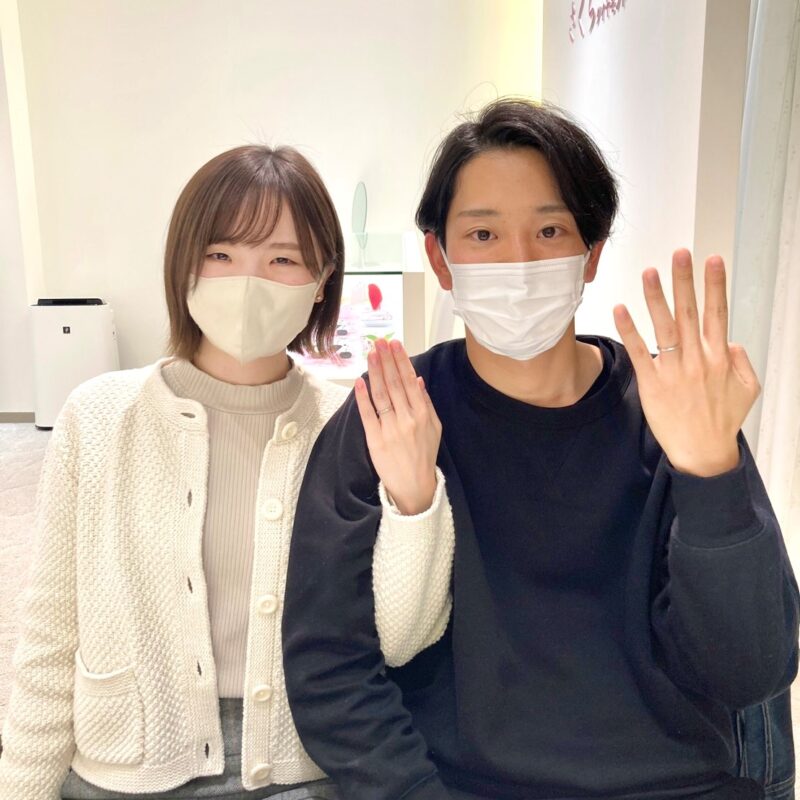 この度は誠におめでとうございます! 初めは彼氏様おひとりでプロポーズ専用リングをご利用いただきました。 彼女様に合ったブルーの石が輝く素敵なネックレスを選ばれた後、おふたりでマリッジリングCAFERINGの『リアン』をお選びいただきました。 『リアン』のミルグレインのラインはおふたりの指輪を繋げると重なり、夫婦となるおふたりの繋がりと永遠の絆を表しています。 お互いを想いあう姿が素敵なおふたりにぴったりな指輪で、とてもよくお似合いでいらっしゃいました! おふたりにとって大切な指輪を当店でお選びいただき大変嬉しく思います。 素敵なご縁をありがとうございます。 また、メンテナンスなどでおふたりにお会いできる日を楽しみにお待ちいたしております。 末永くお幸せに°˖✧ スタッフ:川野